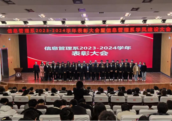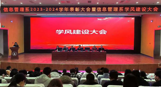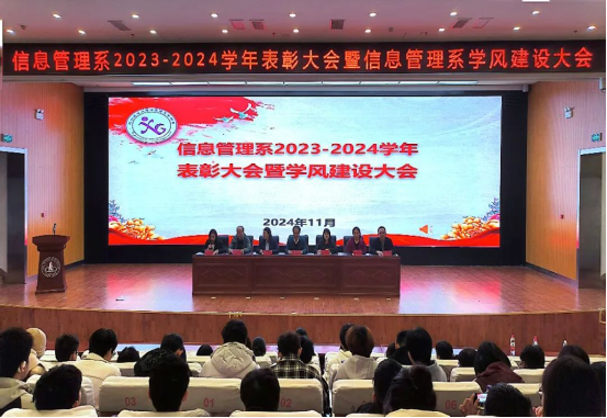 2024年11月12日下午,信息管理系举行2023-2024学年表彰大会暨学风建设大会。系党总支书记杜占江、主任温秀梅、副主任肖丹、教研室主任康丽峰、王海东和办公室主任杨新明出席会议,大会由学工办主任史海嫣主持,信息管理系全体师生300余人参加。